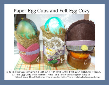 Cut an empty toilet paper roll in half or thirds. Eyeball the burlap by wrapping it around the paper roll and cut to fit. Use glue or gluestick to attach burlap to roll. Cut out your trims and glue them on; allow to dry and then you have a nifty Easter Egg Cup.